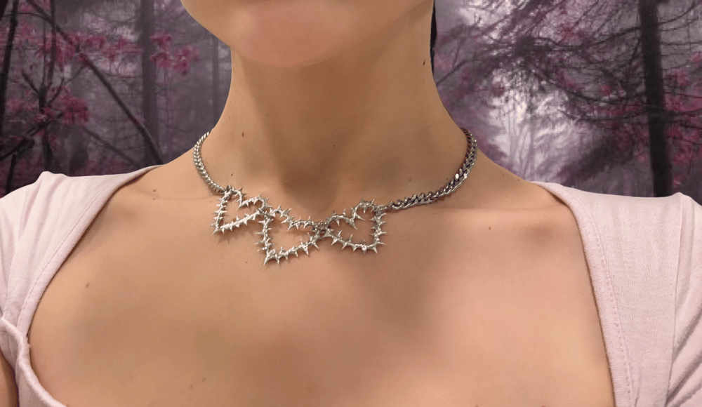 3 hand soldered spiky hearts hung on stainless steel chain, 16”+extender