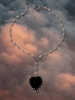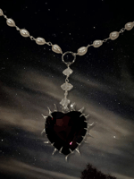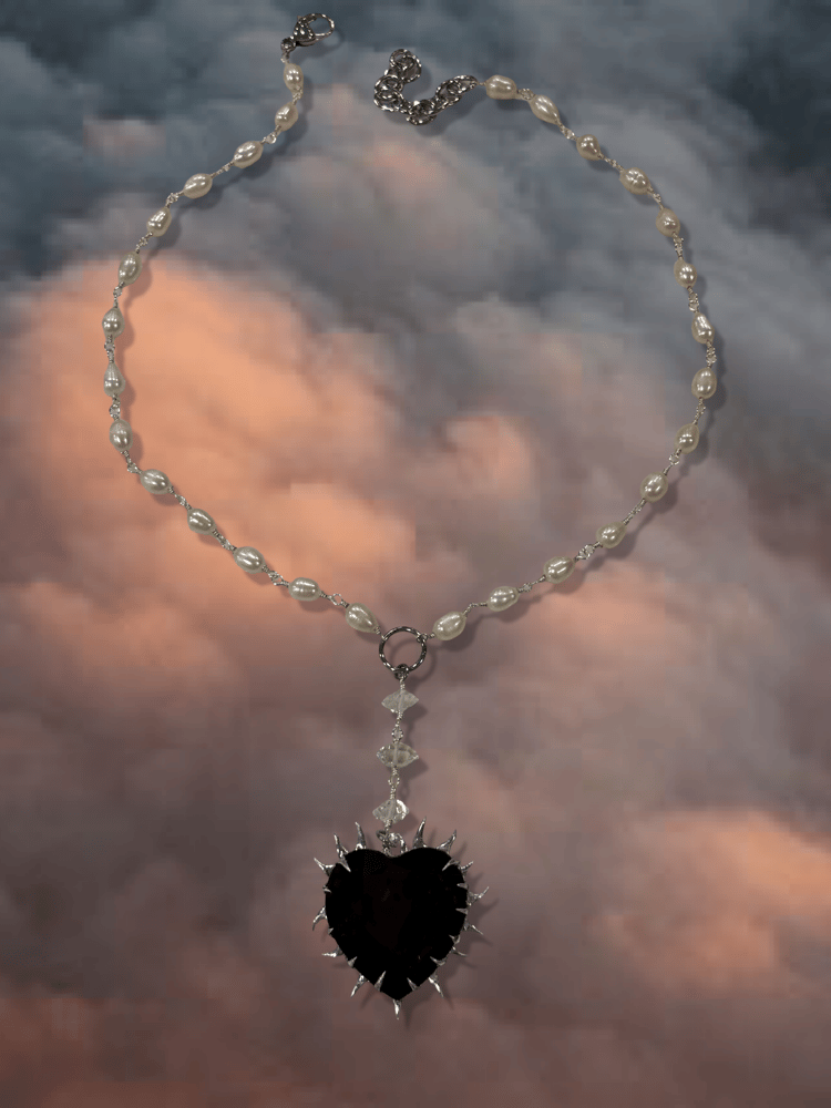 vintage amethyst glass cz heart (25mm) set in hand soldered spikes + hung on double terminated herkimer diamonds + freshwater baroque pearl rosary chain. 16”+extender