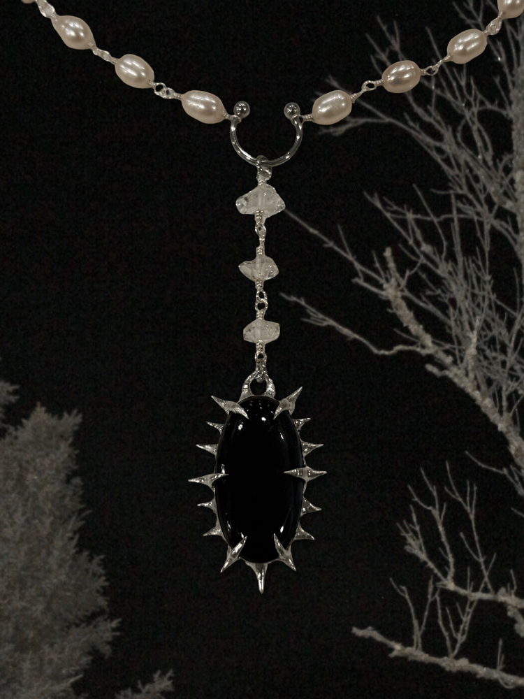 flashy labradorite stone set in hand soldered spikes, hung on double terminated herkimer diamonds + freshwater baroque pearl rosary chain. 16” + extender